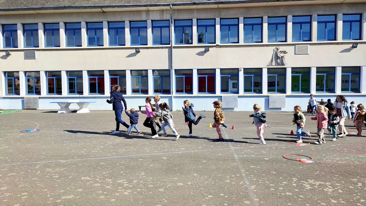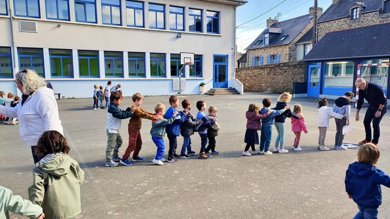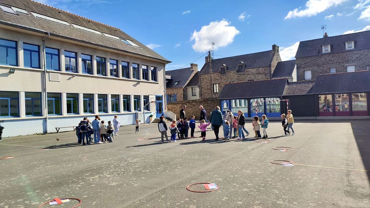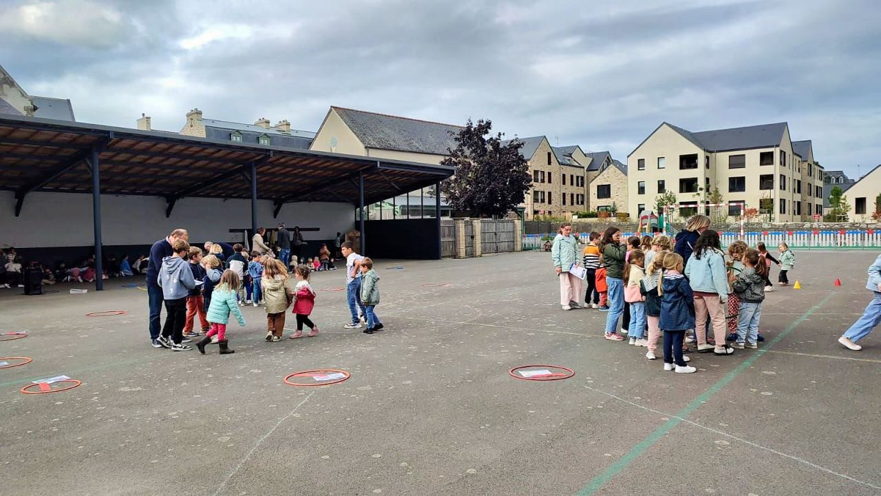 Cet après-midi, tous les élèves de l'école se sont réunis sur la grande cour pour un grand jeu !